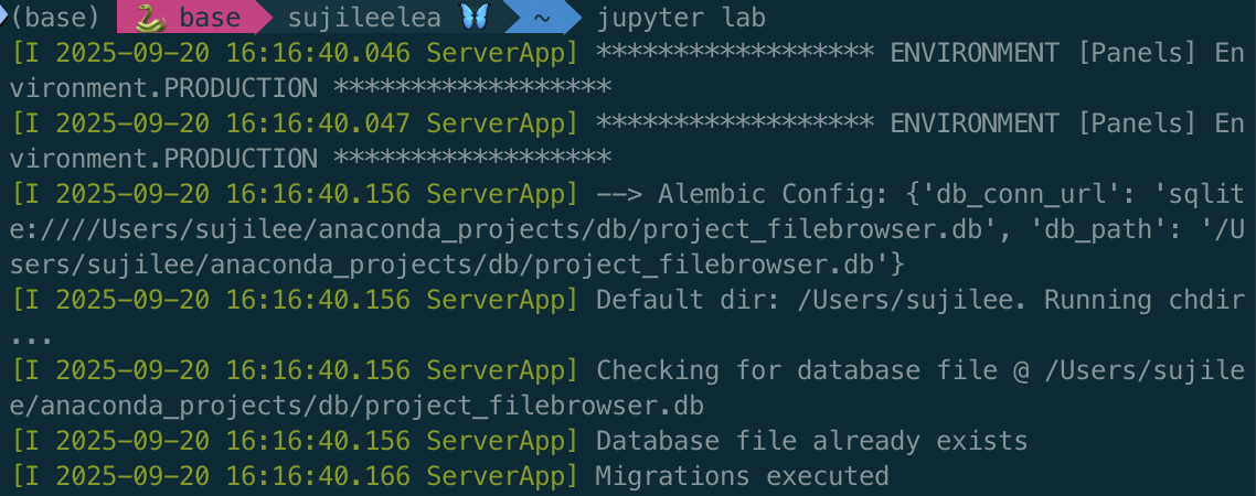 명령어 jupyter lab 으로 jupyter lab을 활성화시키면 기본 브라우저가 자동으로 열리며 해당 서버를 가리킨다.